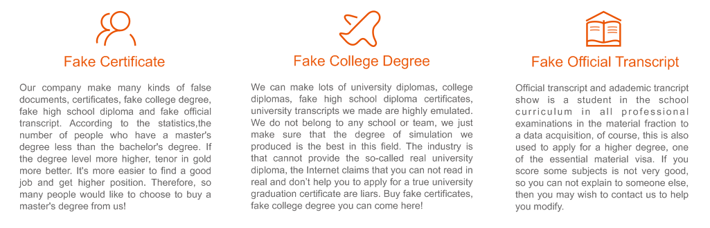| BUY FAKE CERTIFICATE|FAKE COLLEGE DEGREE|FAKE HIGH SCHOOL DIPLOMA|FAKE OFFICIAL TRANSCRIPT Where can I get a fast and true graduation certificate? We can make lots of university diplomas, college diplomas, fake high school diploma certificates, university transcripts we made are highly emulated. We do not belong to any school or team, we just make sure that the degree of simulation we produced is the best in this field. The industry is that cannot provide the so-called real university diploma, the Internet claims that you can not read in real and don’t help you to apply for a true university graduation certificate are liars. Buy fake certificates, fake college degree you can choose us! Is it illegal to buy fake certificates, college degree? There is no doubt that any diploma, university diploma production, production of degree certificates we made, college transcripts are not the real certificate issued by the University. We produced a diploma all customized according to customer needs, and we just provide professional design services for that friends who need to buy. We do not pretend to any school or organization, and we do not claim that we have made university diploma or degree or certificate is true. We just put our production as a new diploma unusual items for sale to customers. To sum up, first,we do not cheat our customers; second, we did not force our customers; third, we did not go to theft, we think that we did not violate the law. So buy fake certificates, fake official transcript from us is legit and easy. |